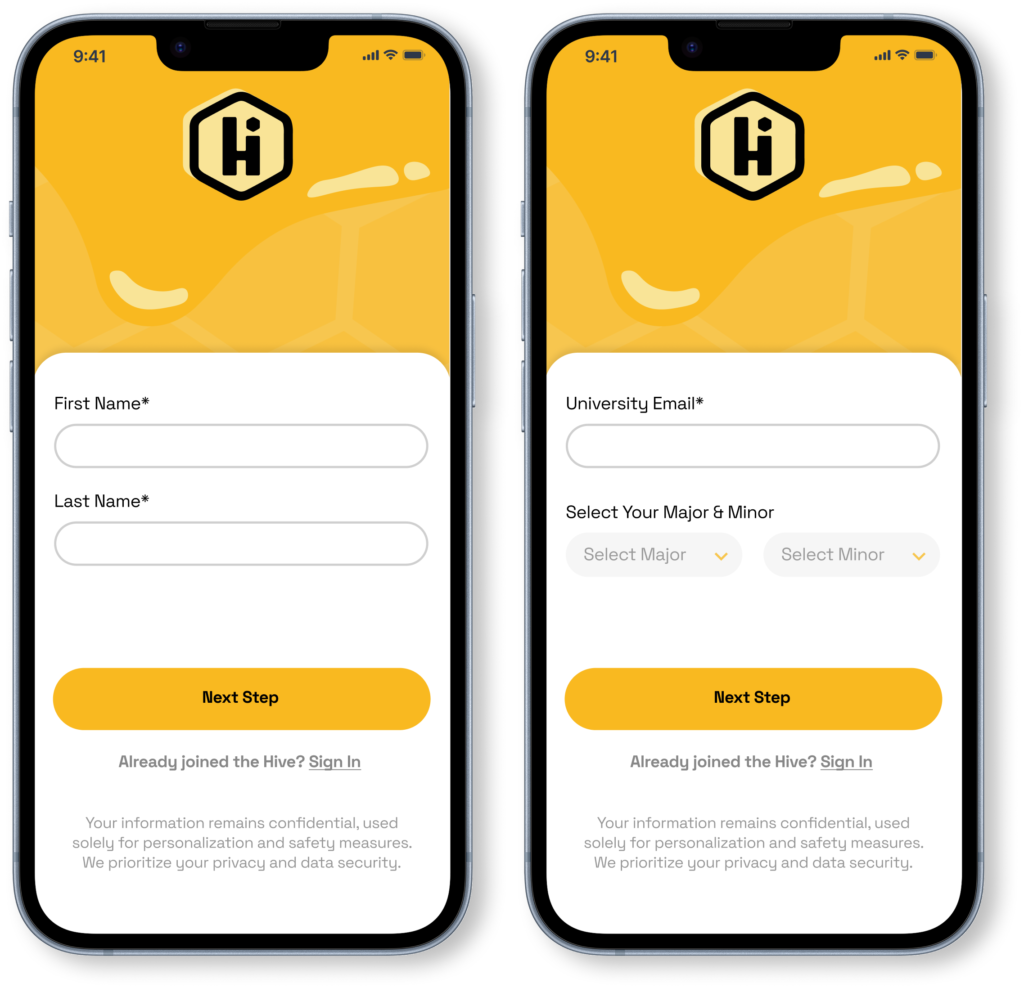 Seamless onboarding that verifies your identity through your college or university. By entering your name, school, and area of study, Hive connects directly to school databases to confirm enrollment, ensuring each Hive is an authentic, student-only community.