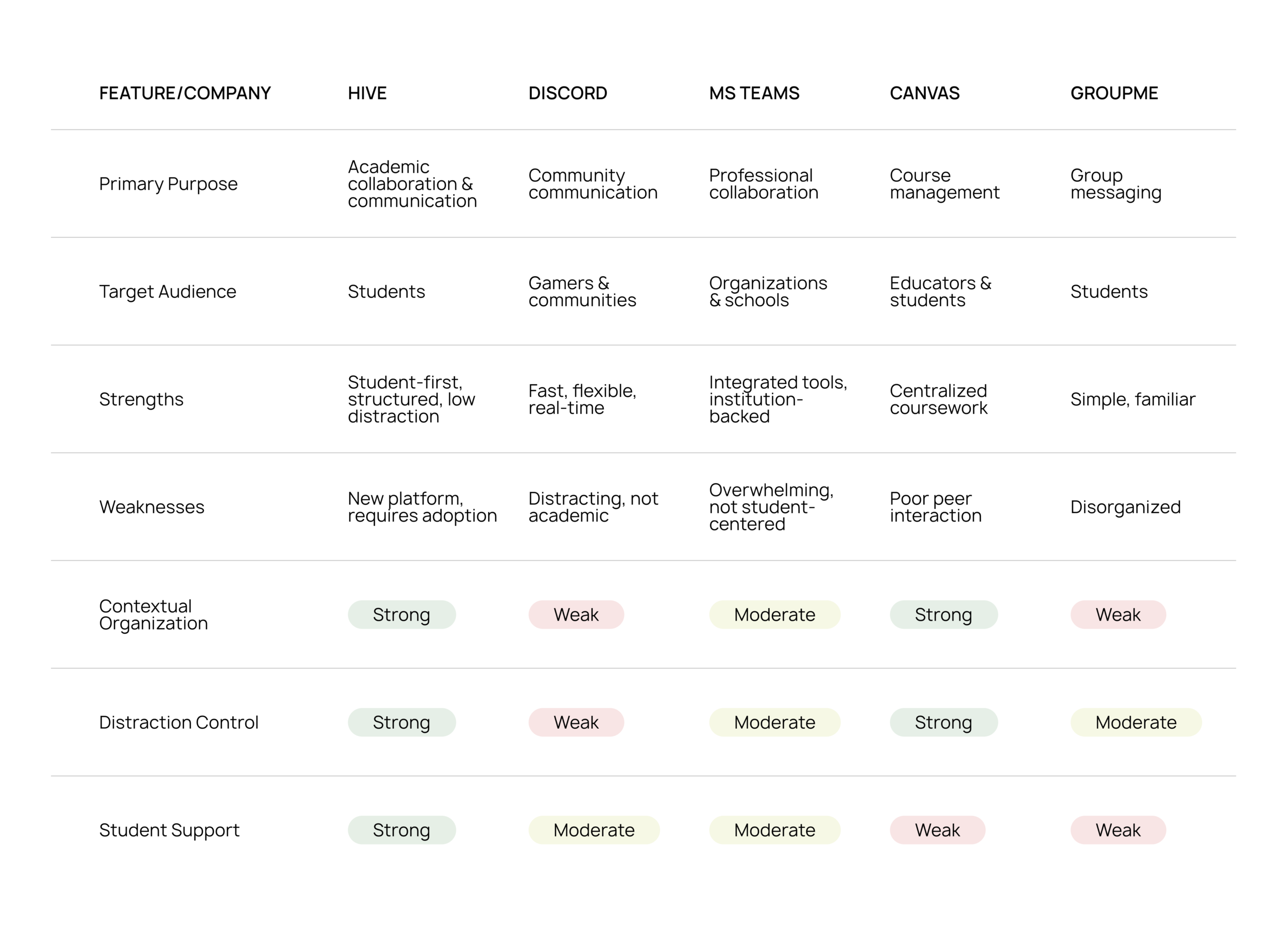 Communication-first tools like Discord and GroupMe are strong at real-time messaging but lack structure and academic organization. In contrast, Canvas provides structure and course organization but offers limited, slow, or disengaging communication tools. Microsoft Teams sits between these extremes but prioritizes professional workflows over student-specific needs.